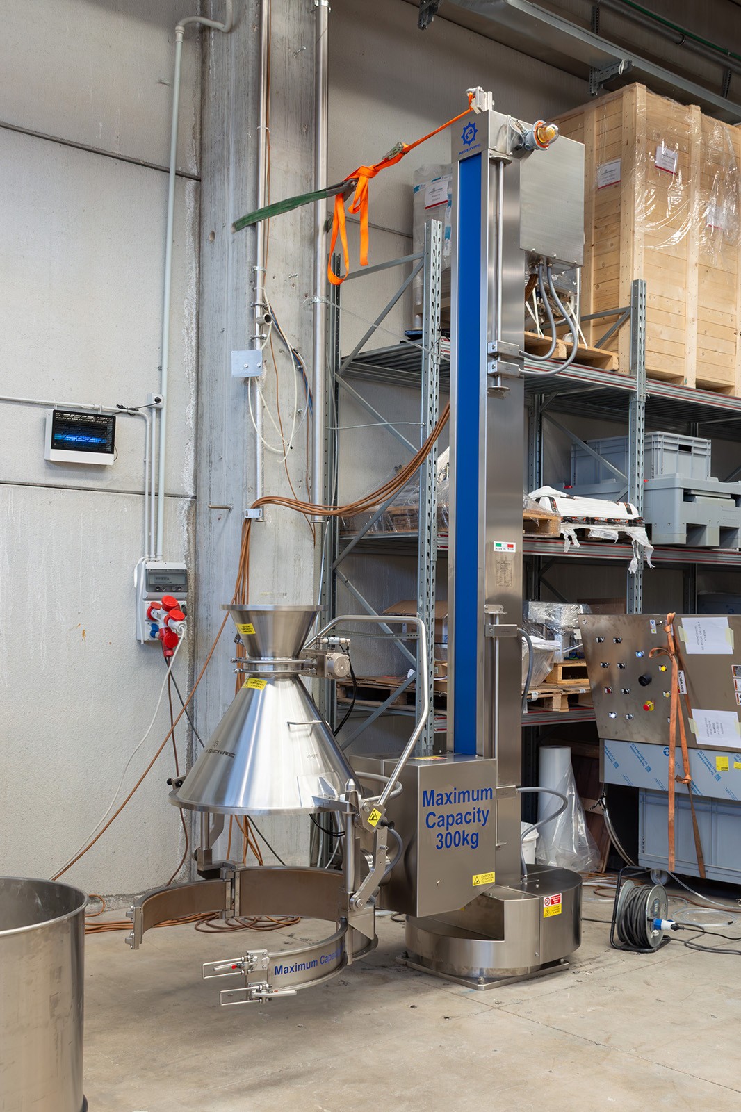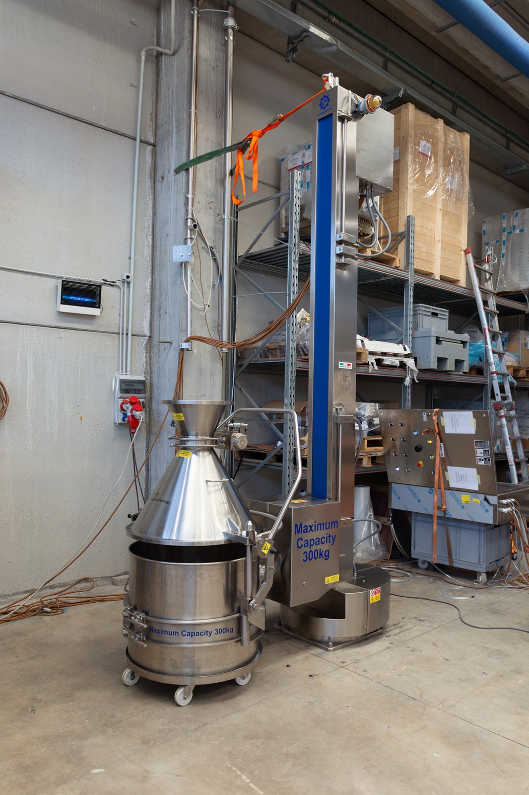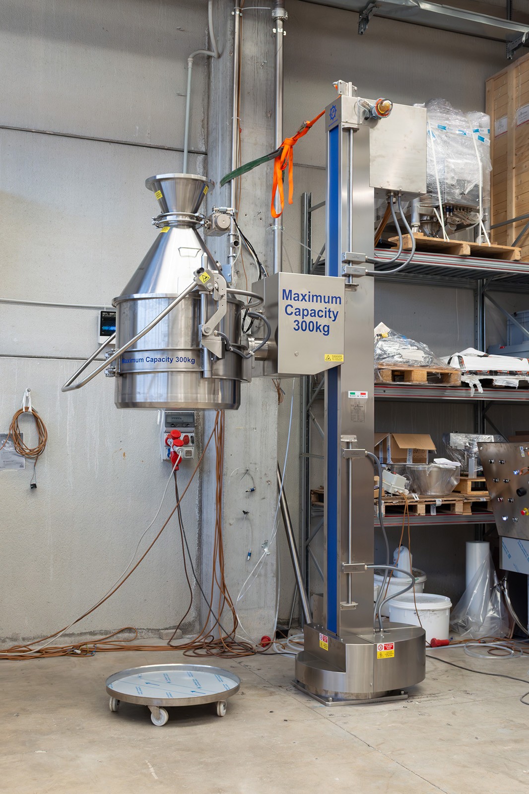 Questa colonna GiraFusti può sollevare, ruotare e scaricare fusti contenenti polveri fino a 300 kg. È dotato di rotazione a 180° e di un pannello di controllo remoto facile da usare.
