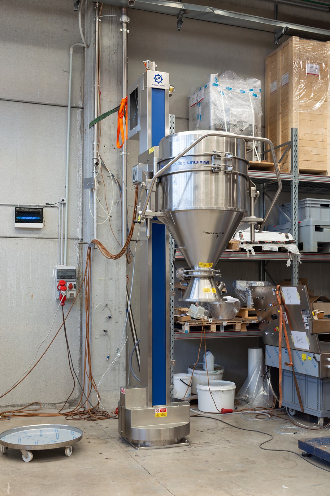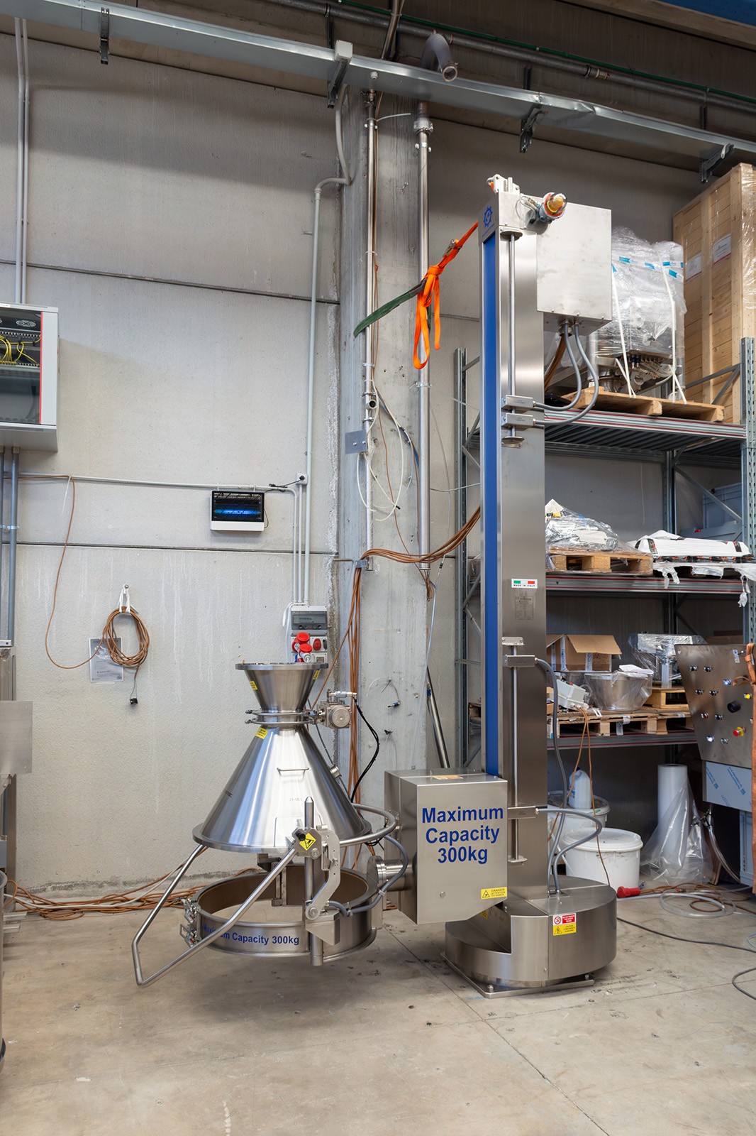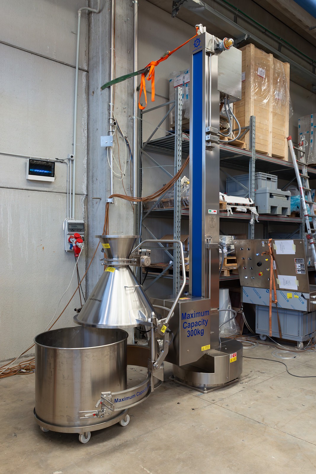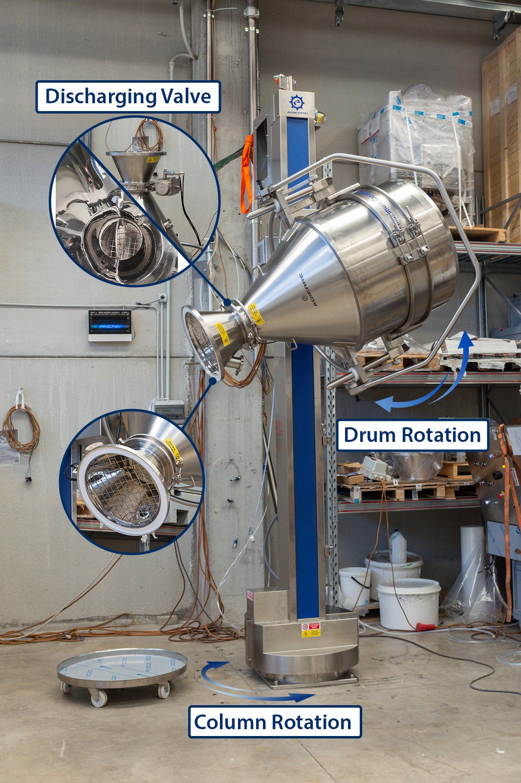Questa colonna GiraFusti può sollevare, ruotare e scaricare fusti contenenti polveri fino a 300 kg. È dotato di rotazione a 180° e di un pannello di controllo remoto facile da usare.